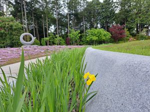 菖蒲の花が咲いた第一号は黄色でした。その奥にはタイムの花が満開になってきています。